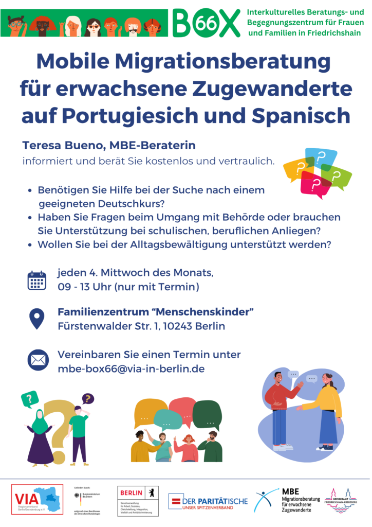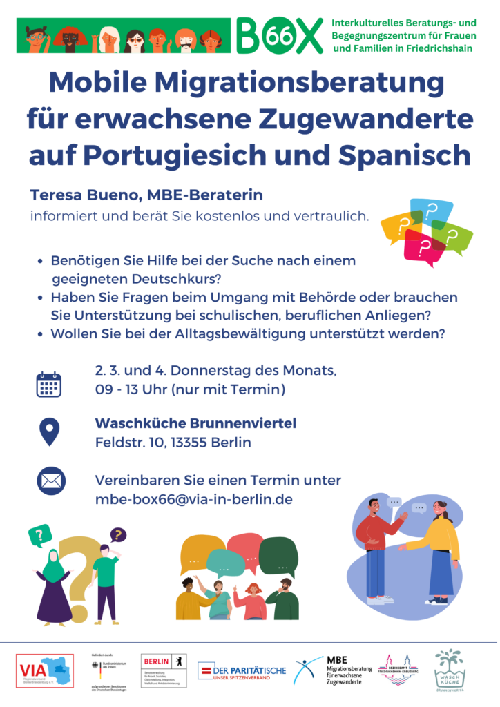 Wusstet ihr schon? Unsere MBE-Migrationsberatung findet nicht nur in der BOX66 statt – wir sind auch an verschiedenen Orten in Berlin für euch unterwegs